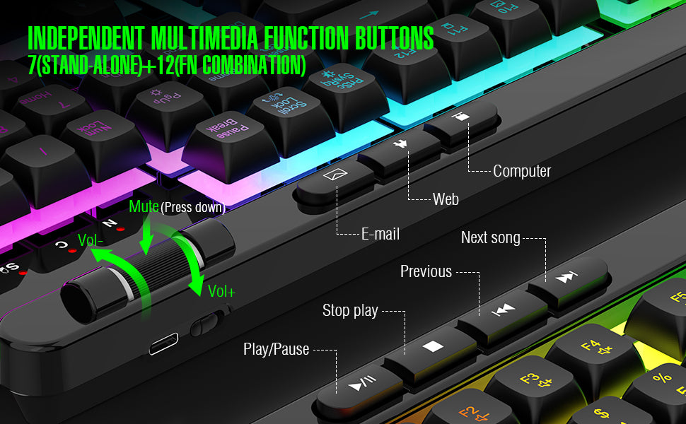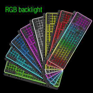 【RGB backlight keyboard with 7 monochromatic lights】This keyboard can switch between more than 10 lighting modes and does not require any software to adjust lighting, making it very easy to use. In addition, pressing the FN+W keys can switch the WASD key to the arrow keys function in gaming mode for gamer.