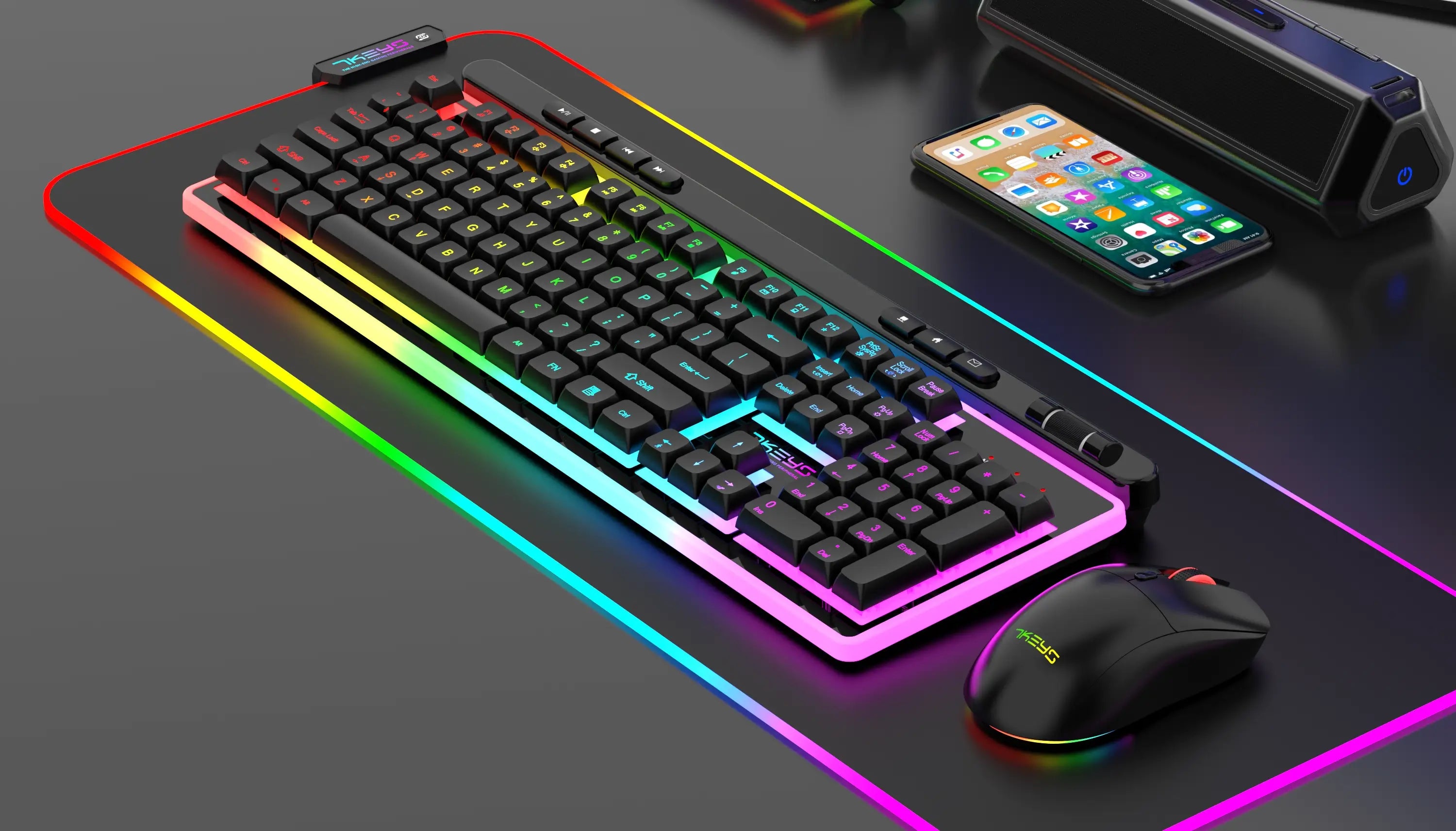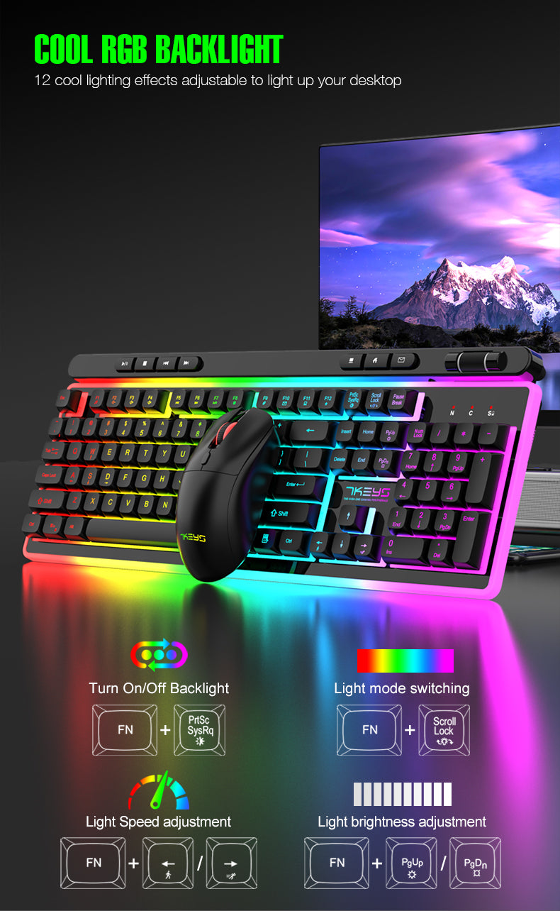 【Fully equipped keyboard and mouse set】Classic and stylish structure——980 keyboard and mouse combo, the keyboard has 7 multimedia function keys, Cool RGB Backlight, Mechanical feel and High capacity battery. Push to use, which is both convenient to use and saves complex operations bring about by key combinations.