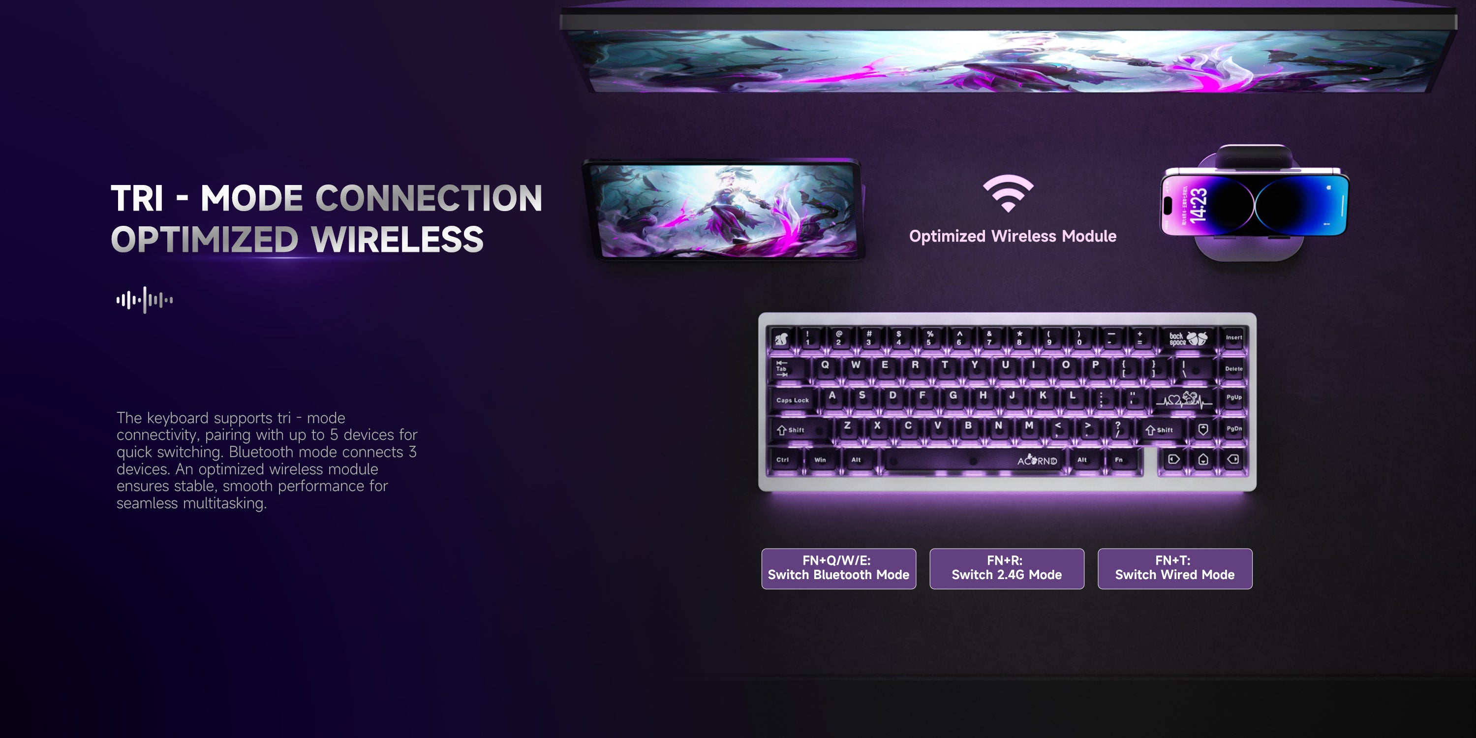 The triple-mode switch is located beneath the TAB key. To turn it on or off, simply remove the keycap. Its hidden design keeps the keyboardâs appearance sleek and unobtrusive, making it a standout feature of the minimalist design.
