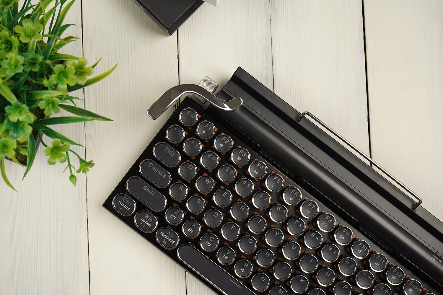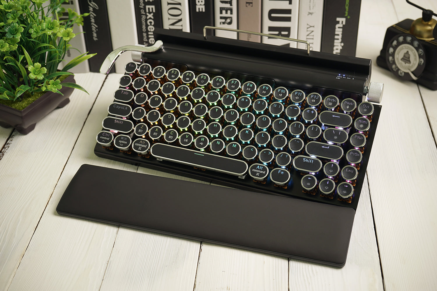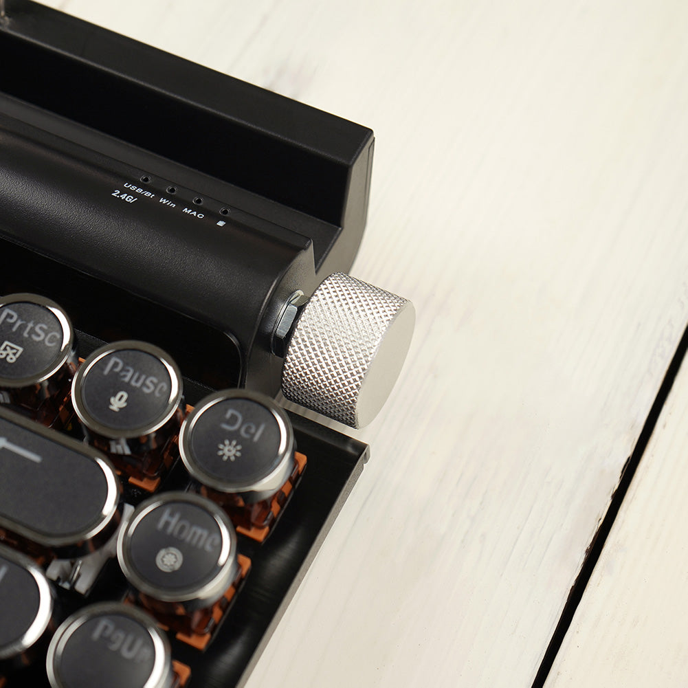 - The Return Lever: Pull the lever to cycle through 14+ dynamic backlight modes. It mimics the carriage return of a real vintage typewriter.