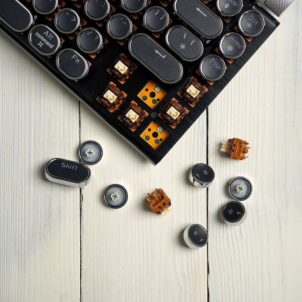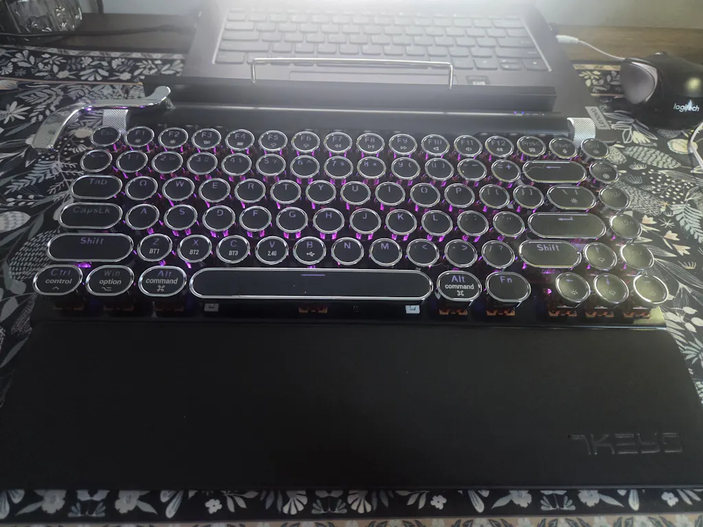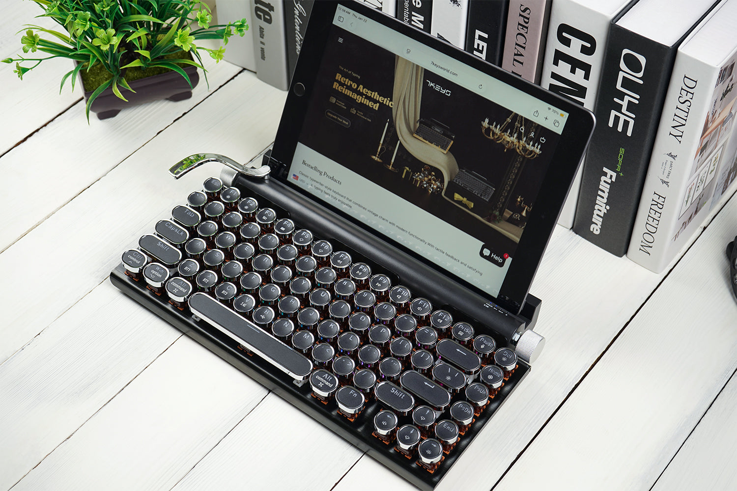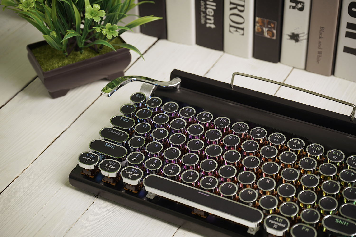 - The Return Lever: Pull the lever to cycle through 14+ dynamic backlight modes. It mimics the carriage return of a real vintage typewriter.