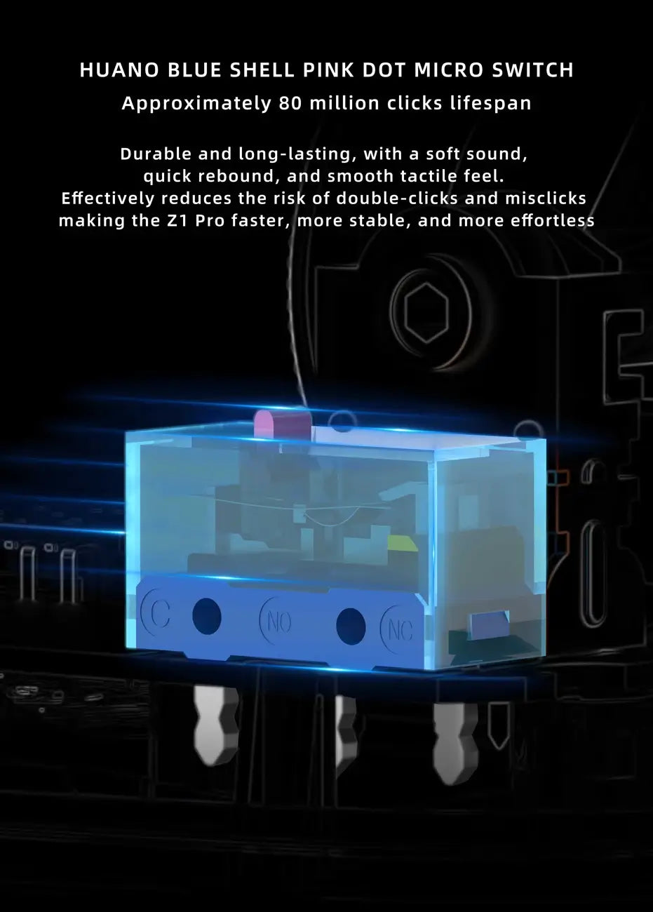 • HUANO Blue Transparent Pink Dot Microswitches rated for 80 million clicks – survive even the most intense gaming marathons.